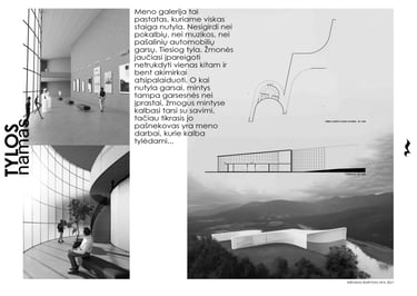 „Tylos namas“ – tai meno galerijos projektas, kuriame architektūra kuria sąlygas ne tik darbų kontempliacijai, bet ir vidiniam žmogaus dialogui su tyla. Pastatas įkurdintas gamtos apsuptyje, tarp kalnų ir vandens, kur išnyksta miesto triukšmas, o išorinis pasaulis nutyla.