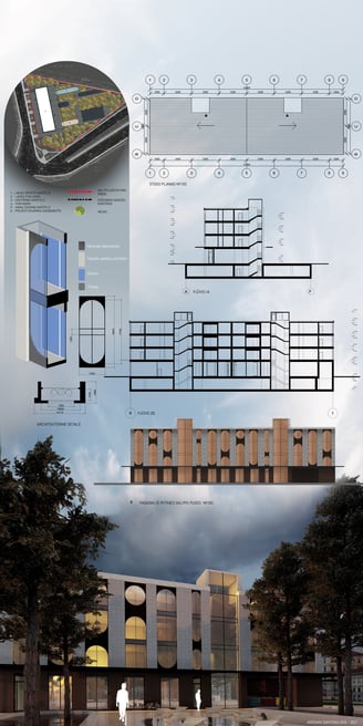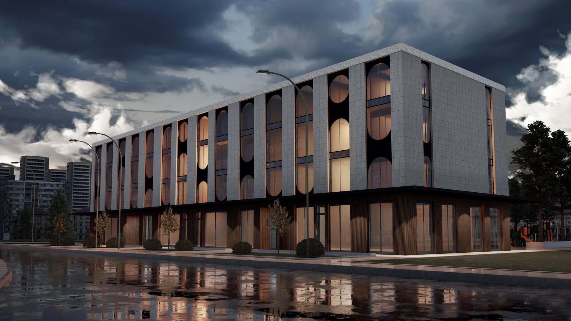 Pagrindinis projektavimo impulsas kilo iš paprastos tūrio schemos, kuri buvo modeliuojama pjūviais ir ertmėmis, siekiant sukurti atpažįstamą fasado ritmiką ir išskirtinę vizualinę tapatybę. Fasado kompozicijoje išryškėja ritmiškai pasikartojantys vertikalūs langų segmentai su švelniomis arkomis, kurių pusapvaliai intarpai įneša monumentalumo, žaismingumo ir aiškų atpažįstamumą.